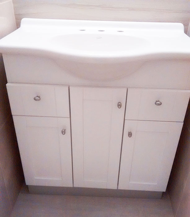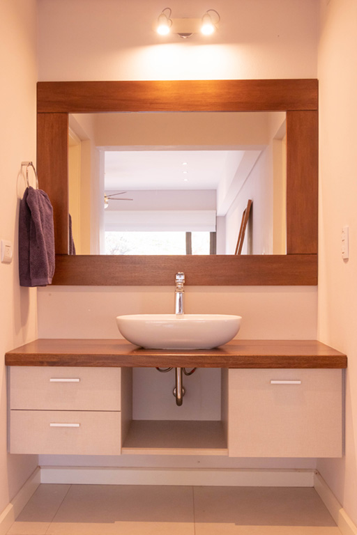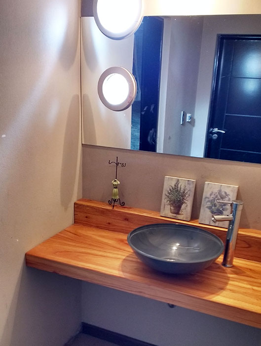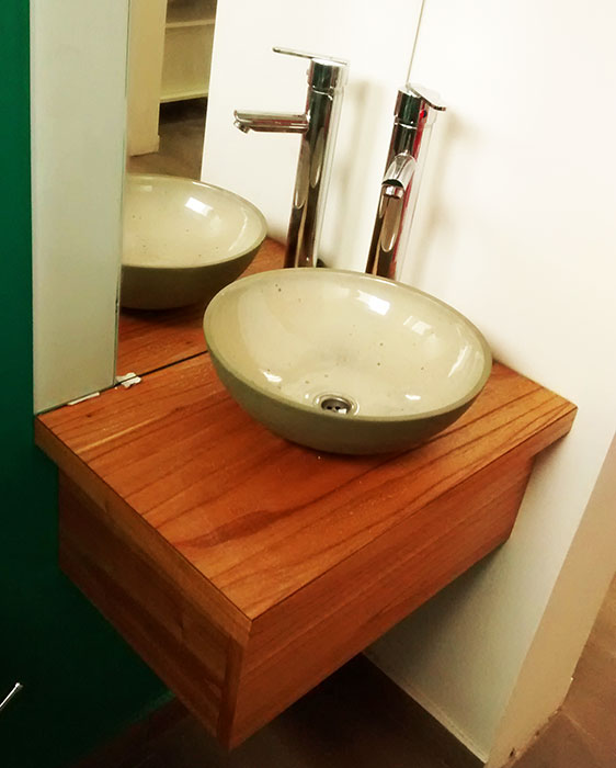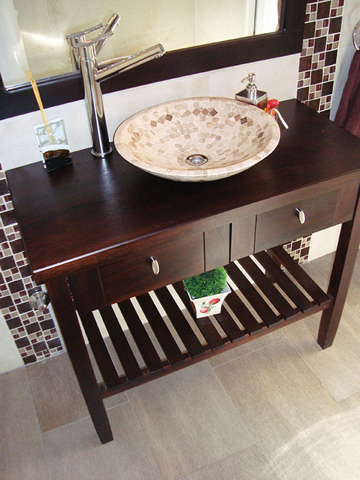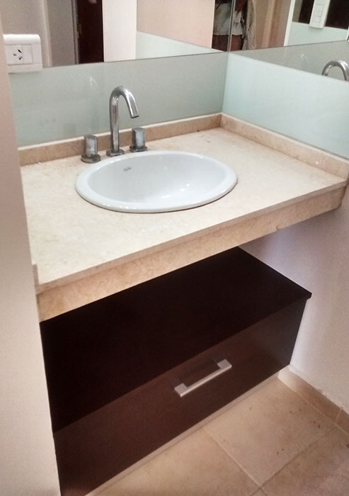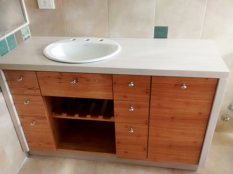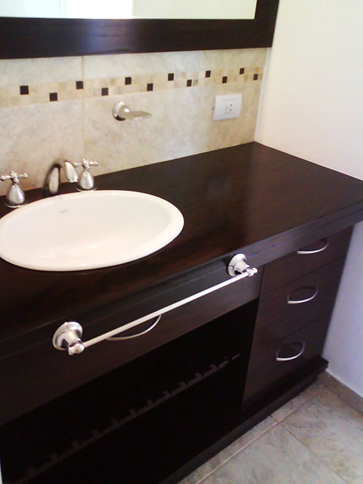 Realizamos muebles de baños en varios materiales, como ser laqueados con poliuretano blanco o color a elección, madera o melamina. Se ubican accesorios como ser cajones, puertas, y canastos tipo canguro para la ropa.