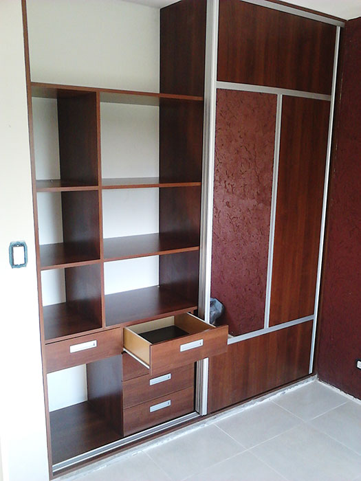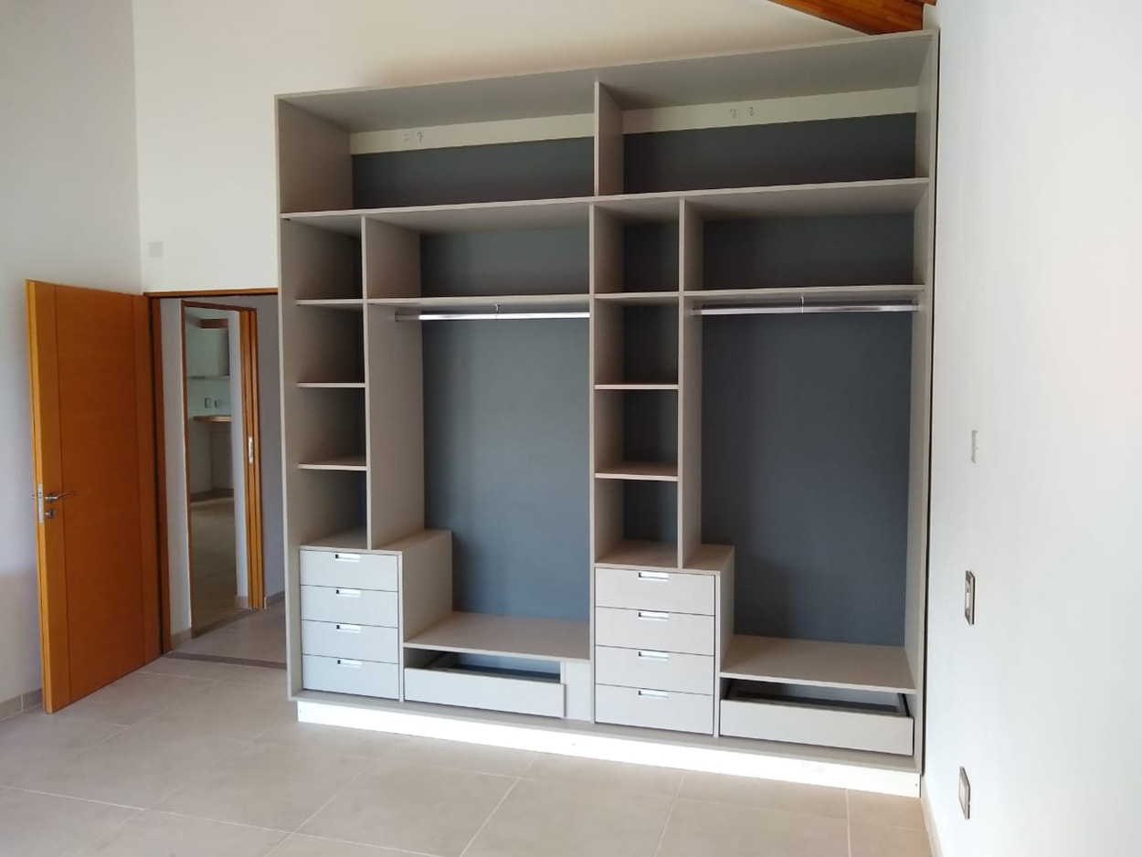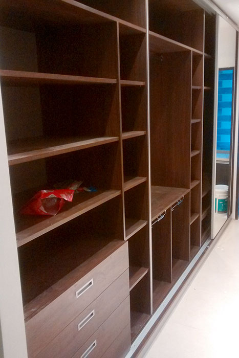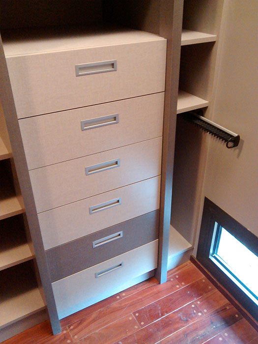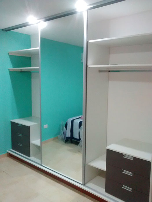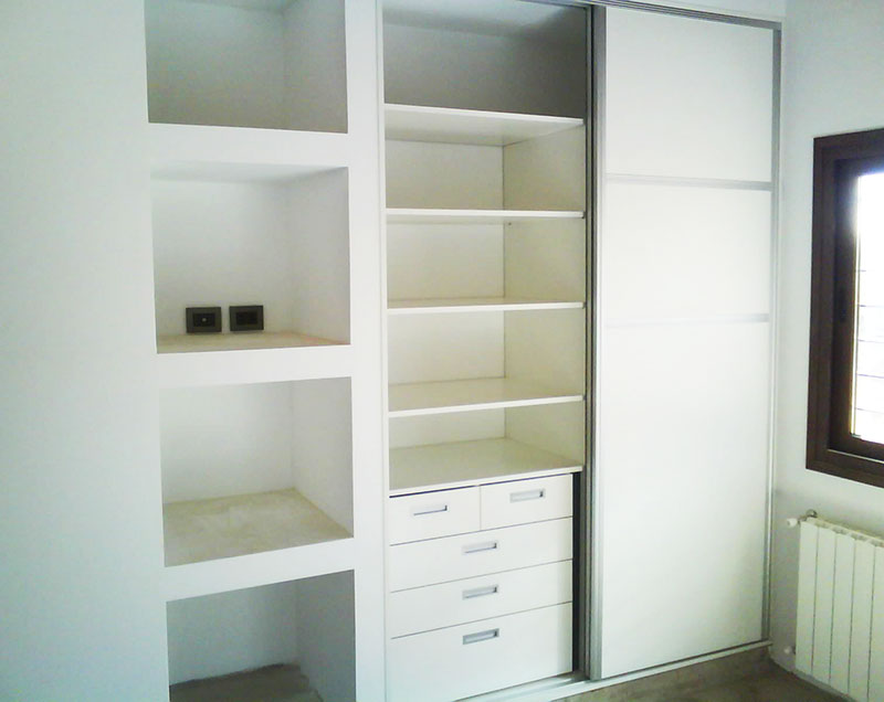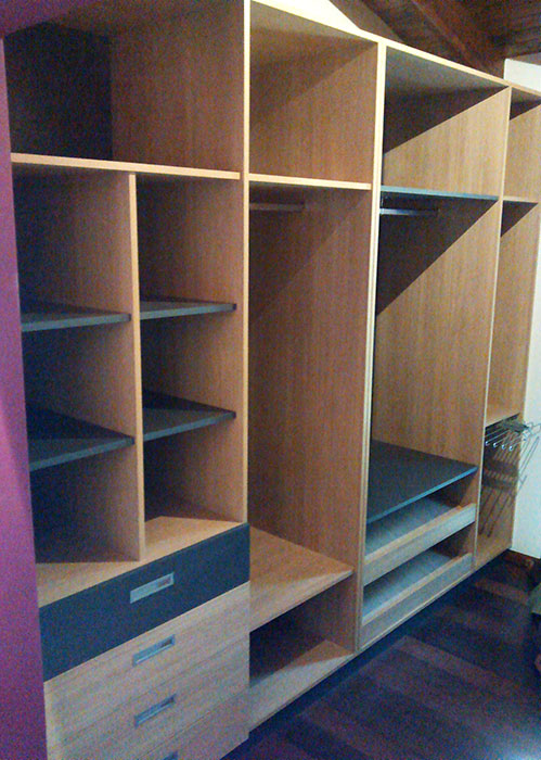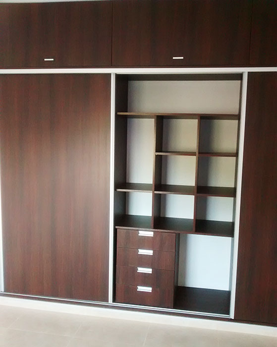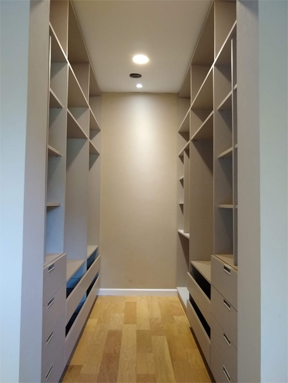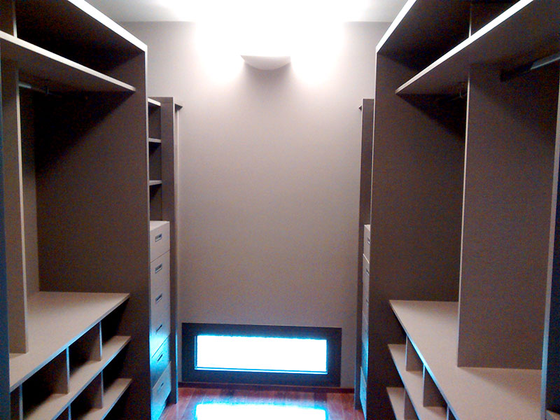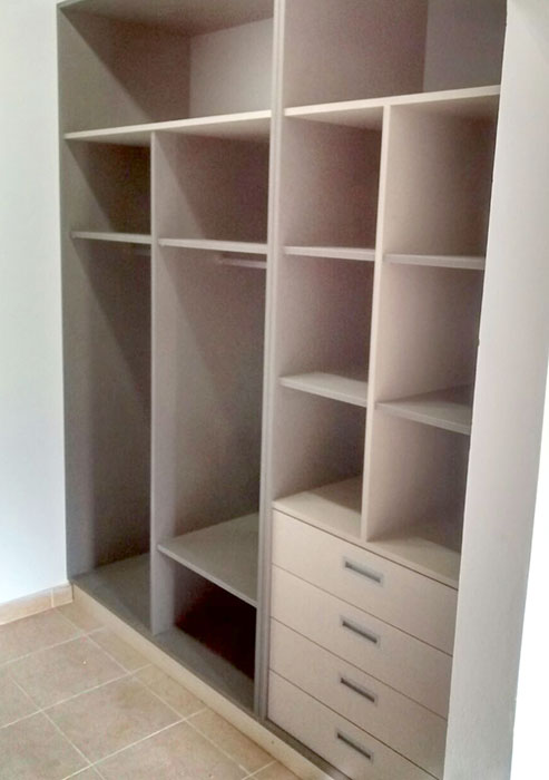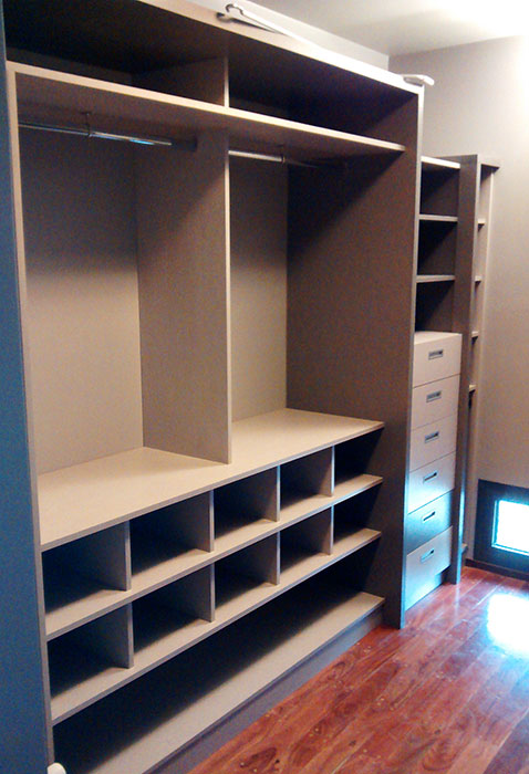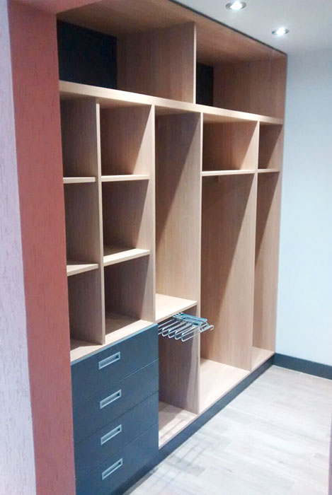 Los vestidores van sin puertas y tienen laterales, piso, techo y fondo en melamina de un mismo color o combinados.